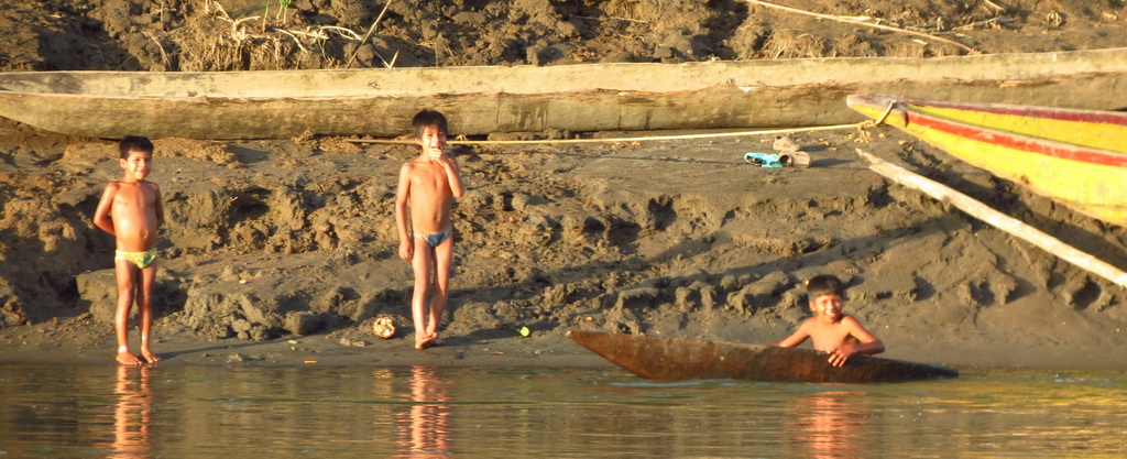 Indigenous communities and their cute, curious kids. The vessel to the right is a dug-out canoe, called a “casco” in river-lingo.
